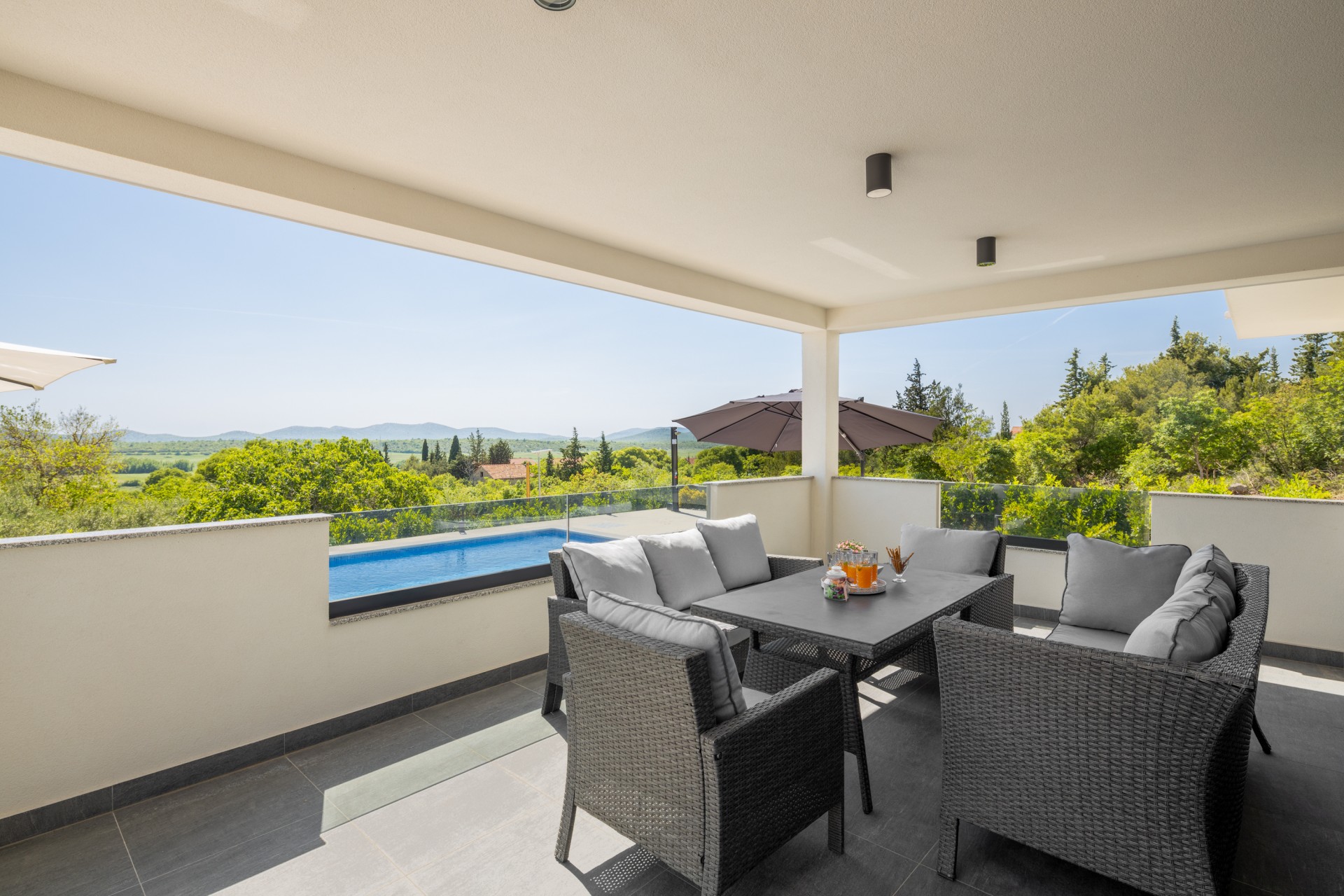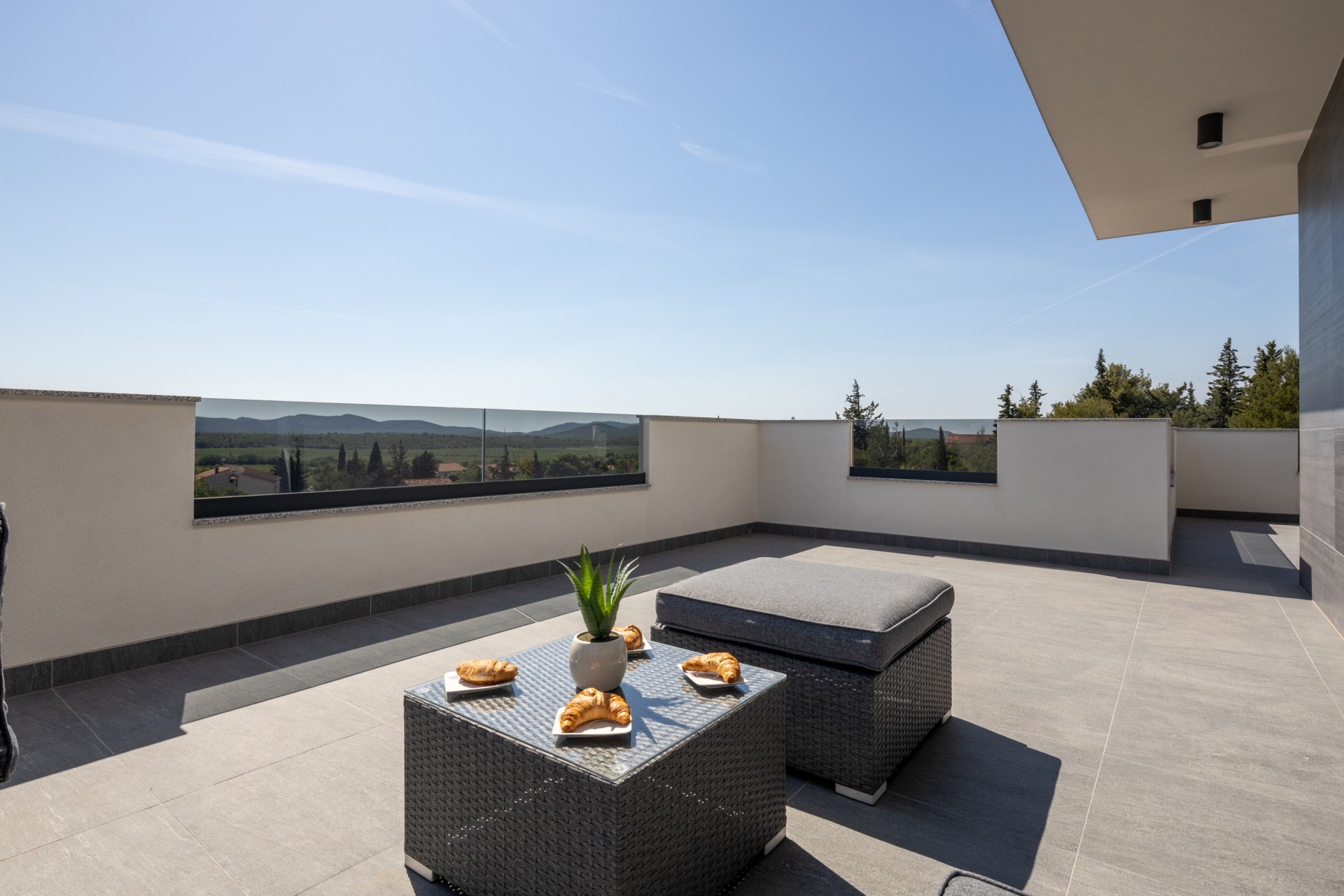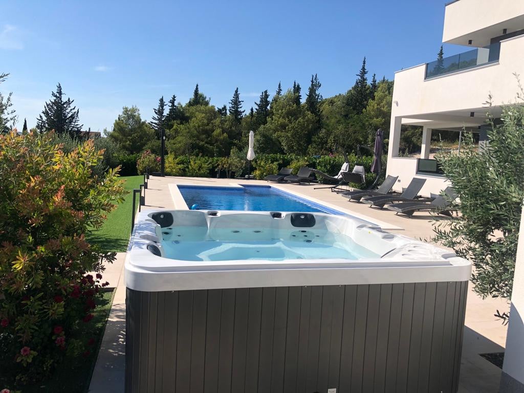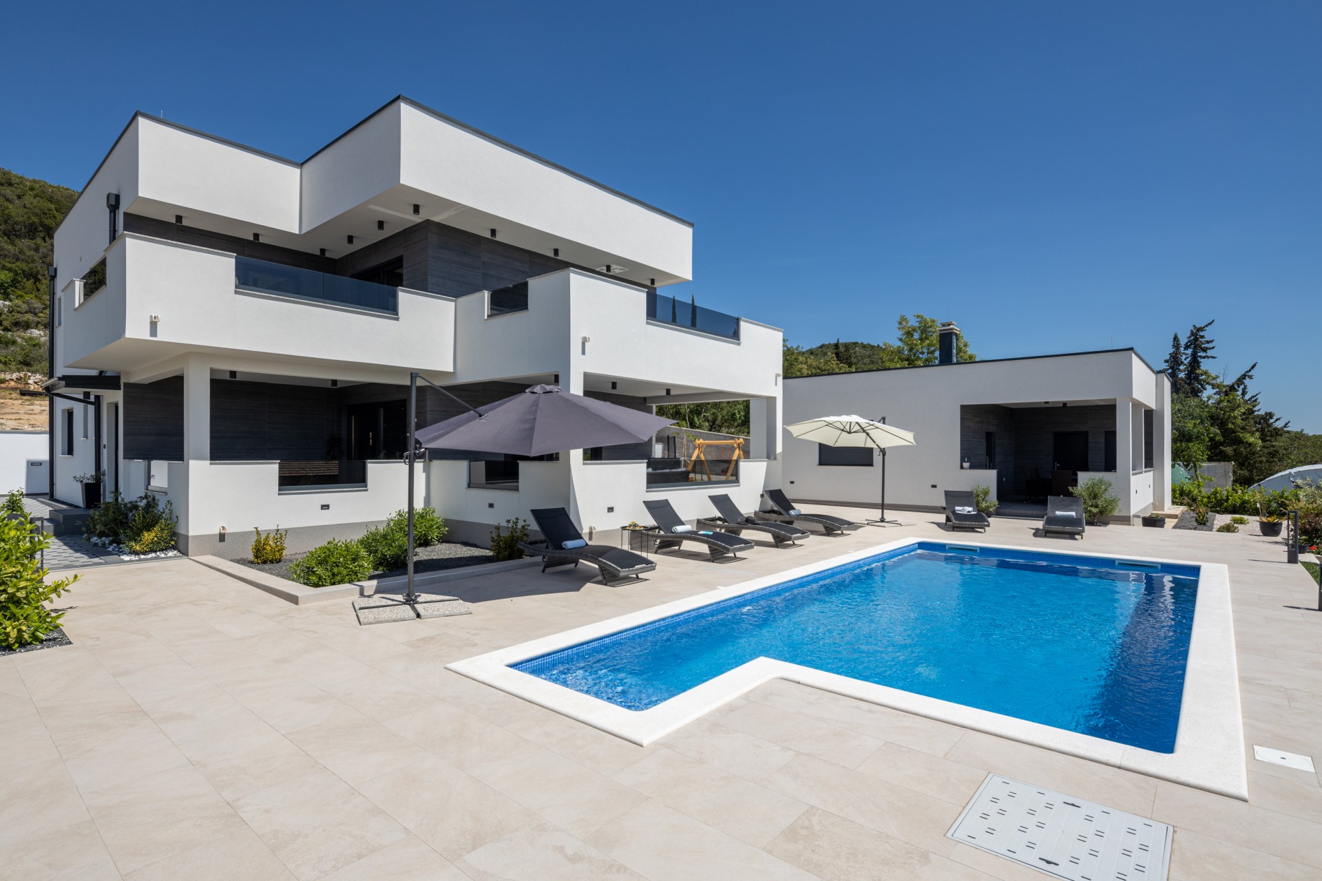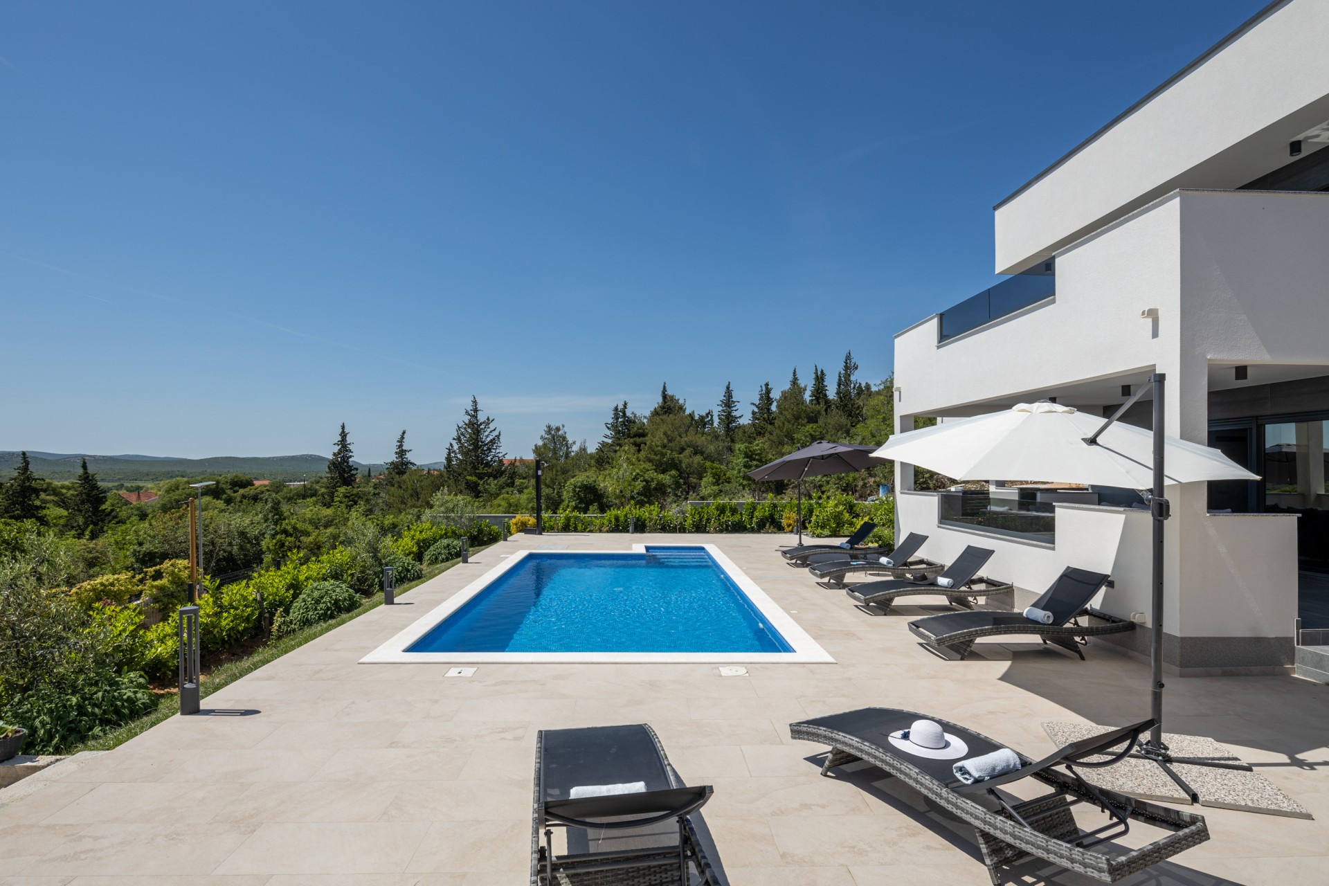 Villa Bura is a modernly designed luxury villa, located in the continental part of the Vodice. The whole villa, both on the inside and the outside, is designed minimalistic, with a lot of touches of black colour. The terraces have a glass fence which enhances the amazing view, while the interior is accentuated with stone walls.