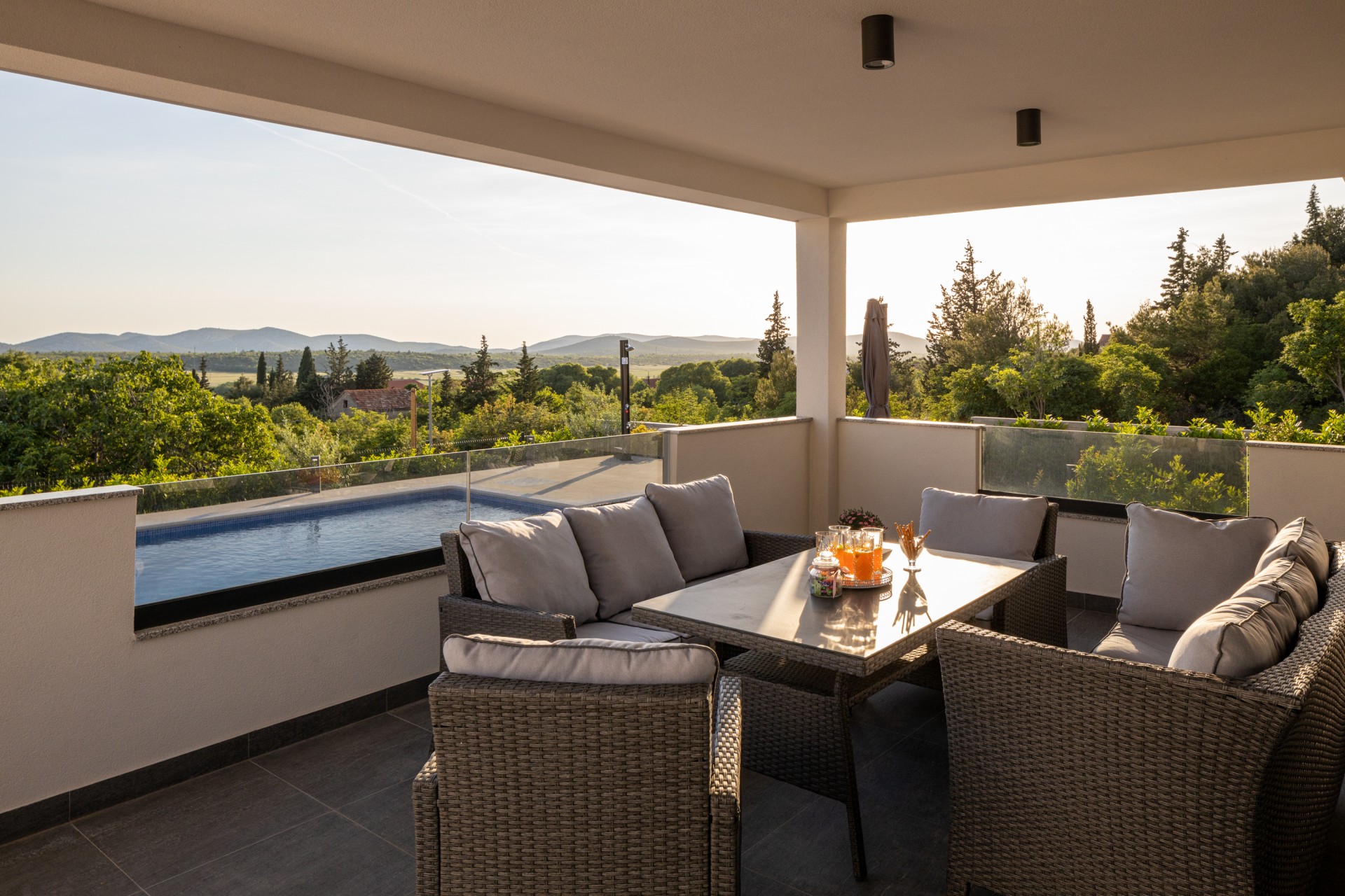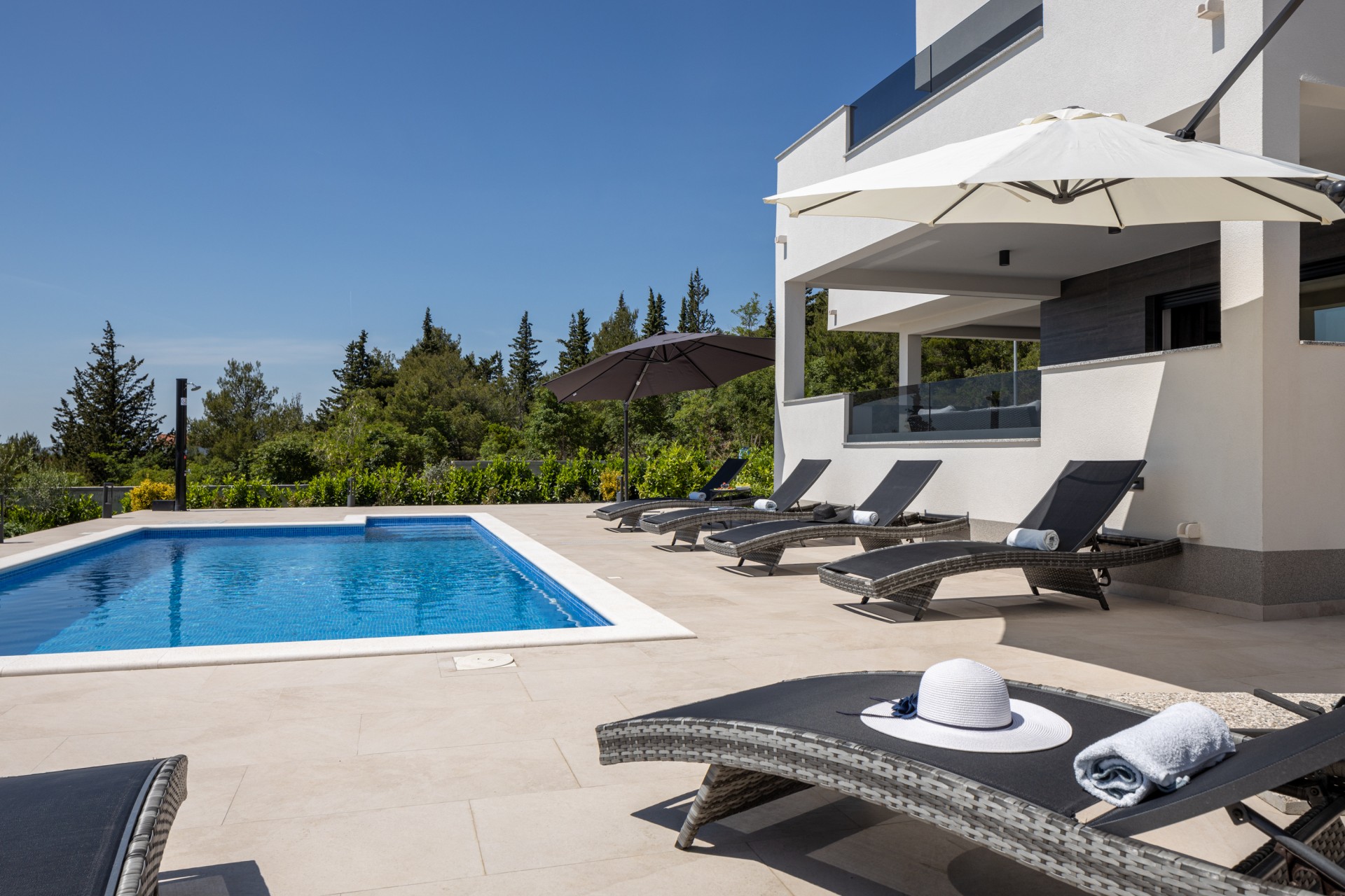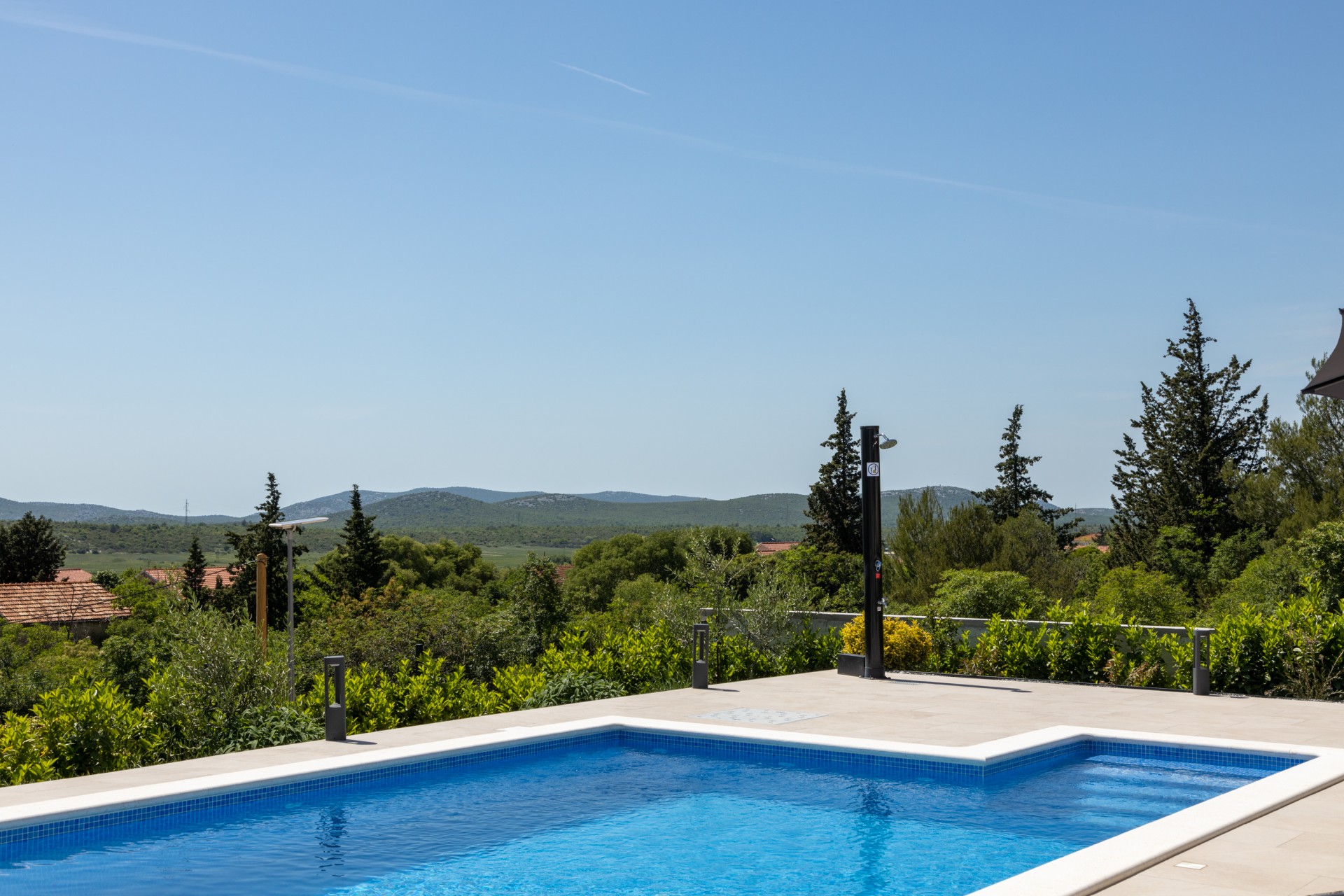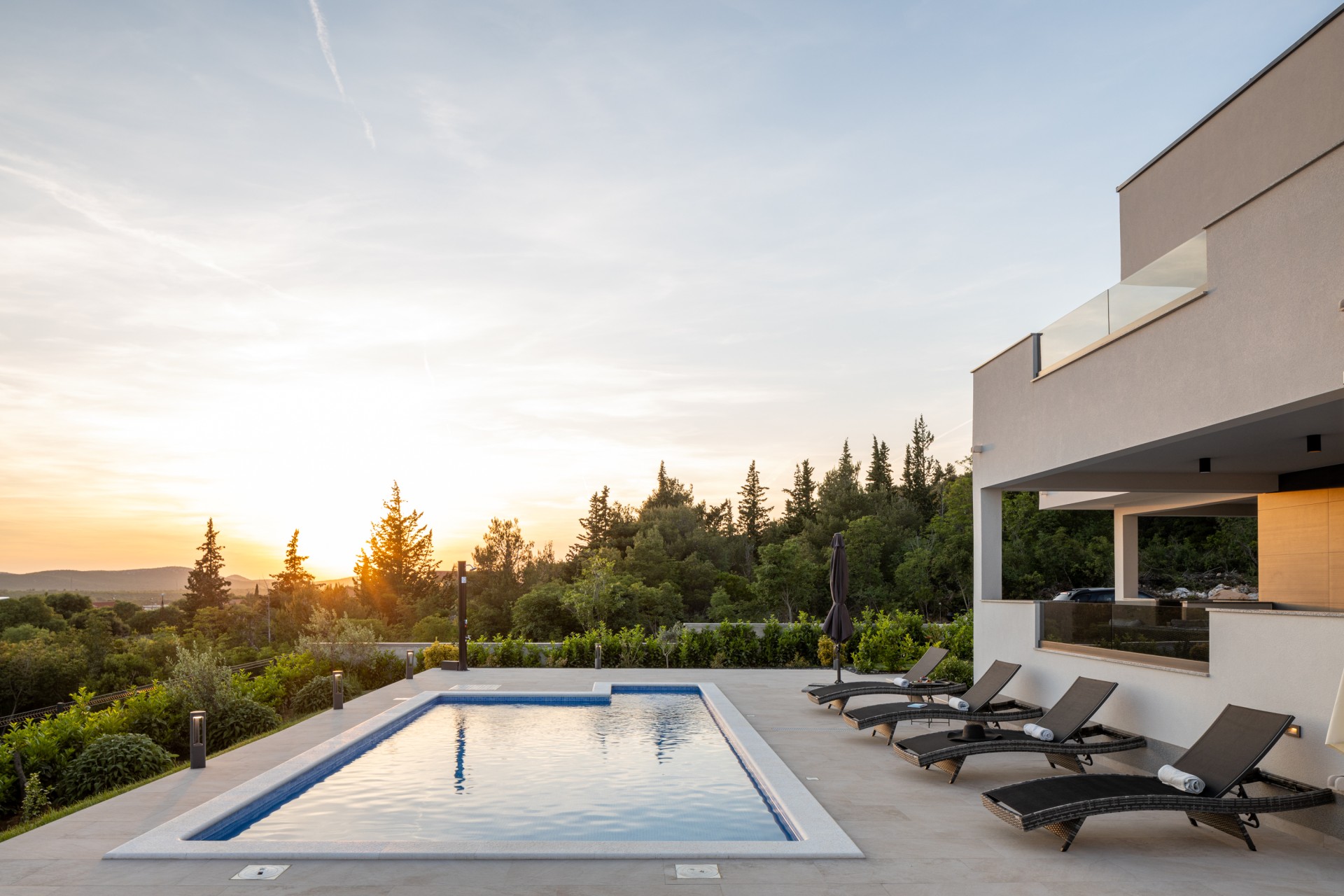 Villa Bura is a modernly designed luxury villa, located in the continental part of the Vodice. The whole villa, both on the inside and the outside, is designed minimalistic, with a lot of touches of black colour. The terraces have a glass fence which enhances the amazing view, while the interior is accentuated with stone walls.