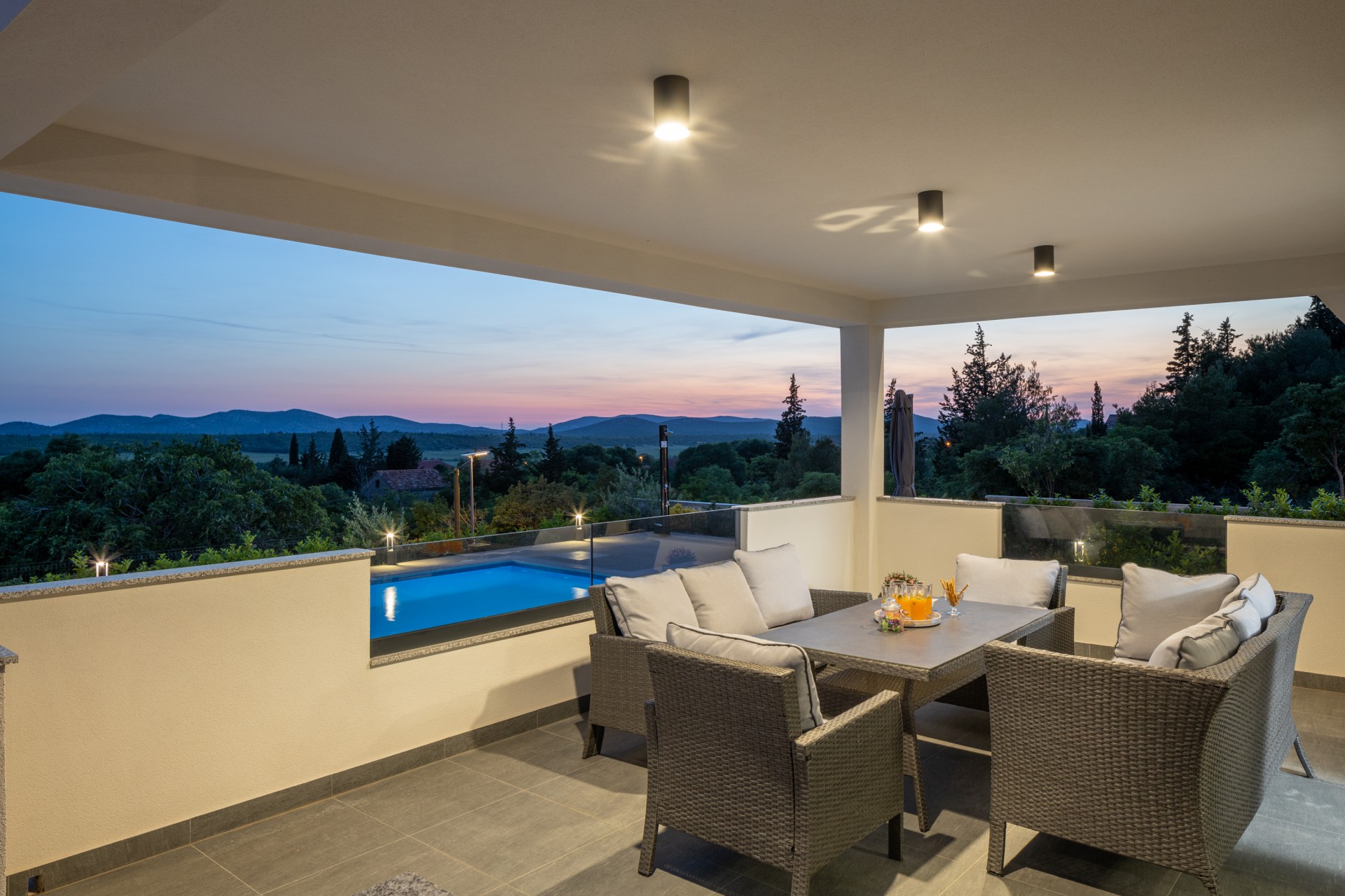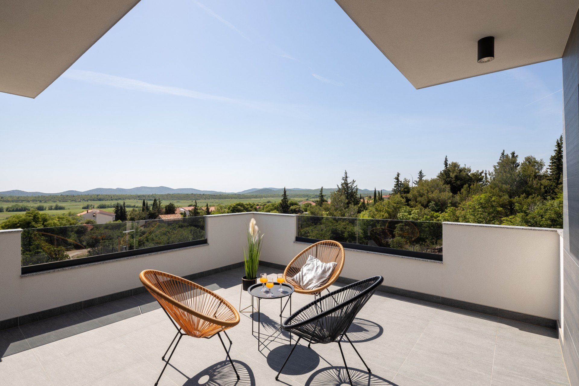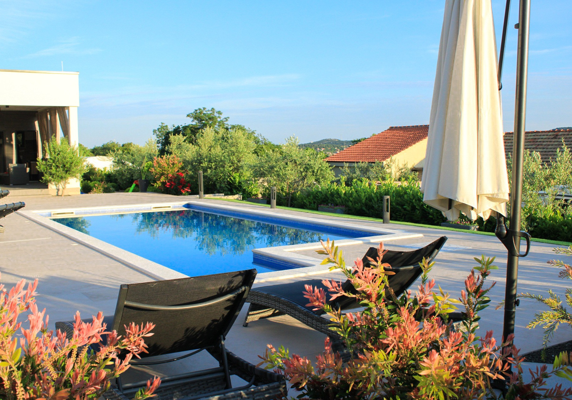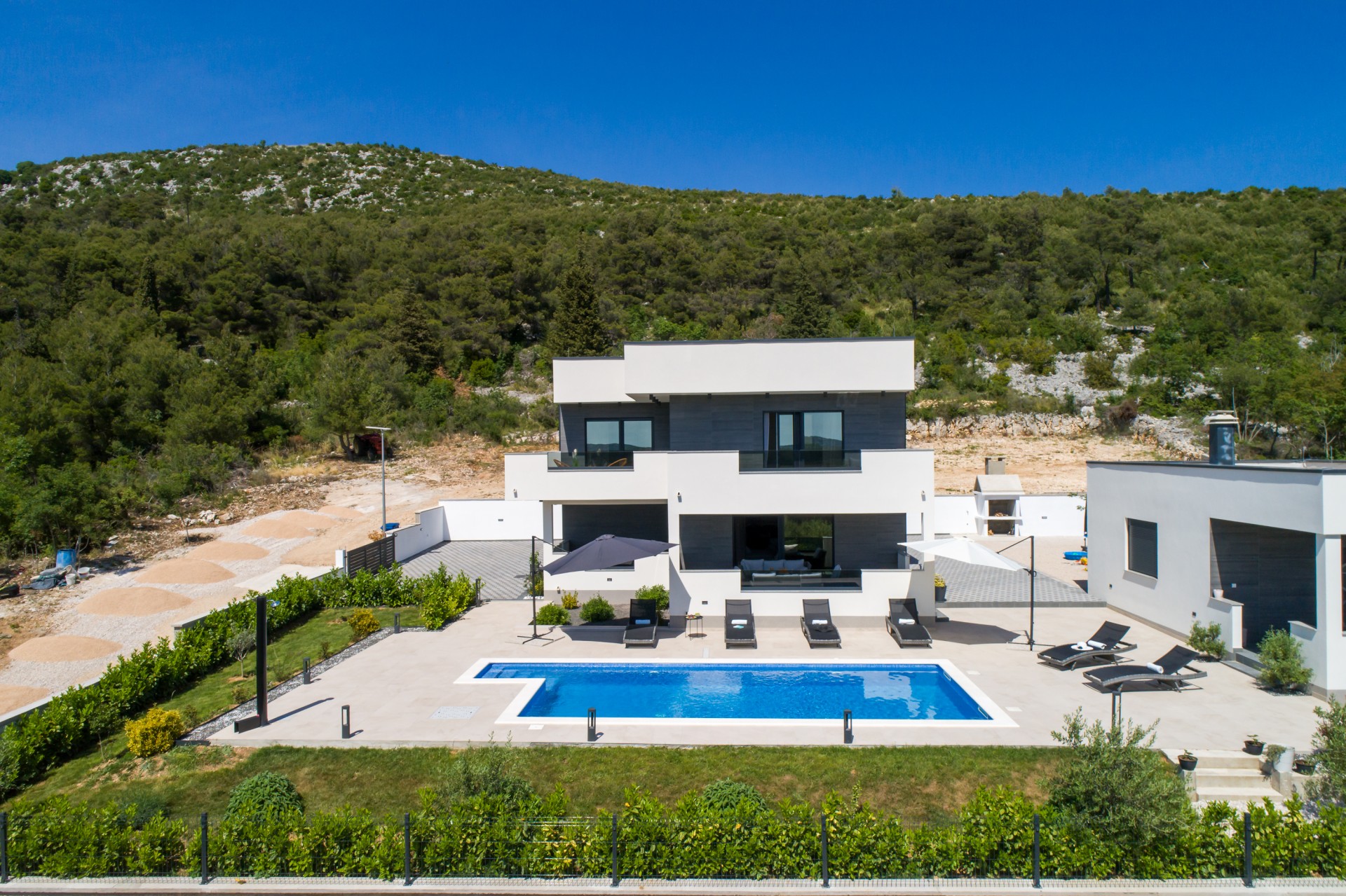 Villa Bura is a modernly designed luxury villa, located in the continental part of the Vodice. The whole villa, both on the inside and the outside, is designed minimalistic, with a lot of touches of black colour. The terraces have a glass fence which enhances the amazing view, while the interior is accentuated with stone walls.