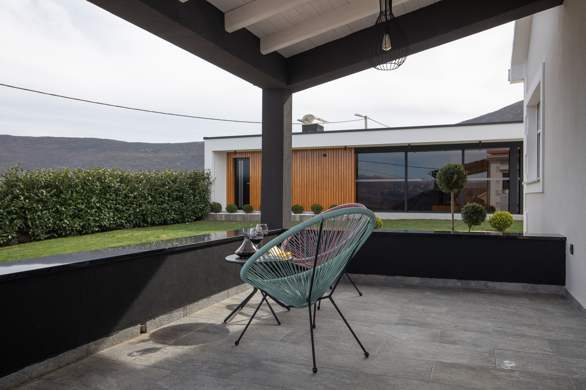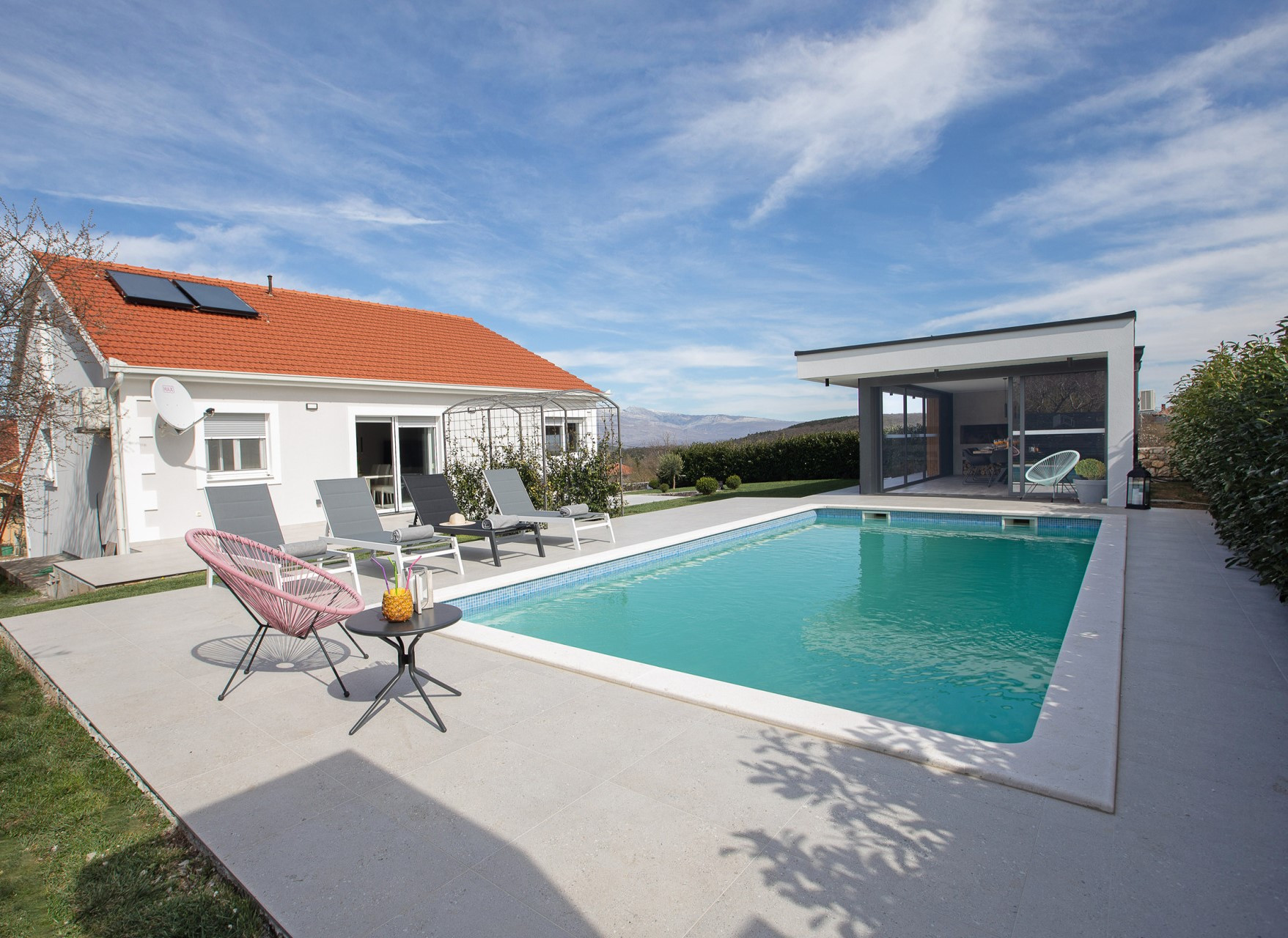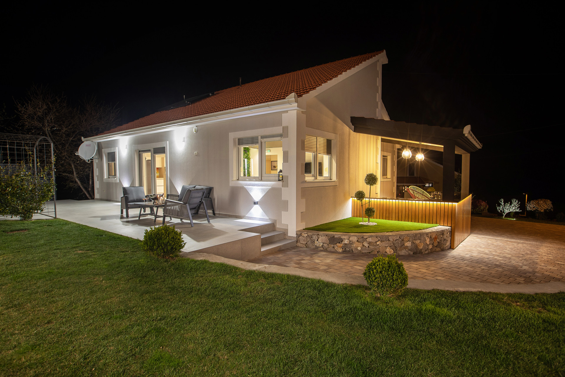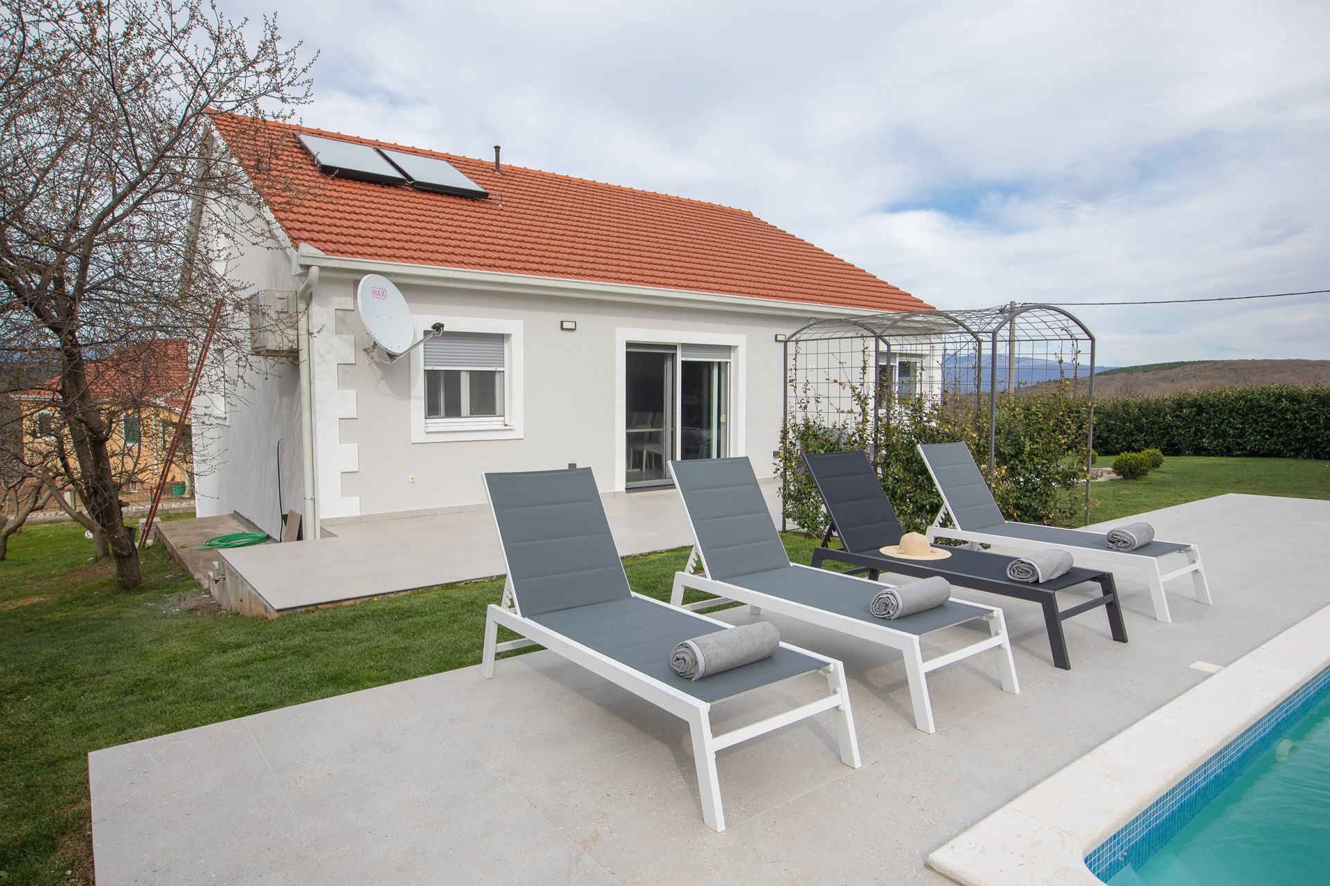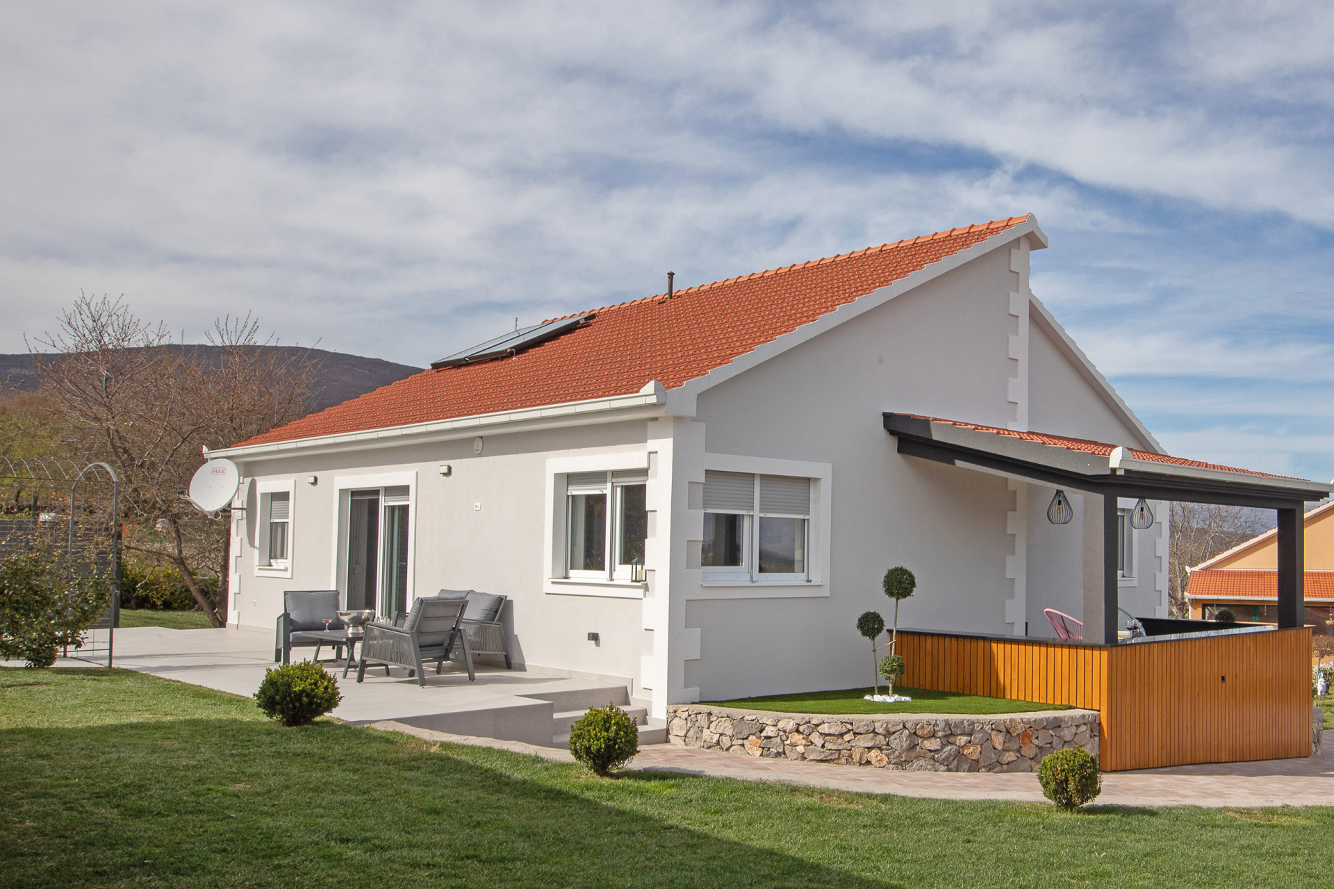 This decent one-story house speaks for itself with its design. The elegant interior decoration contrasts with the surrounding rural area, contributing to a special experience of a Mediterranean holiday. A spacious living room and a modern fully equipped kitchen with a dining room will charm you with its black and gray aesthetics.
