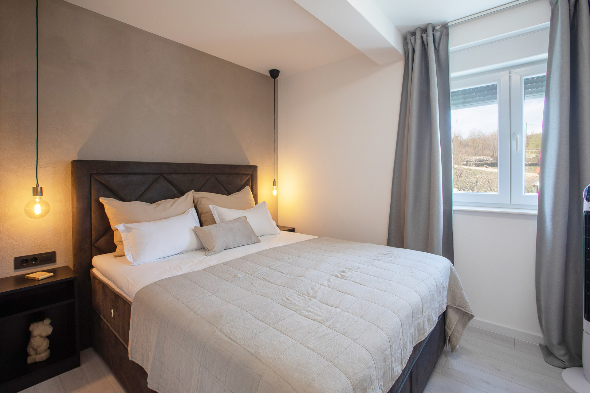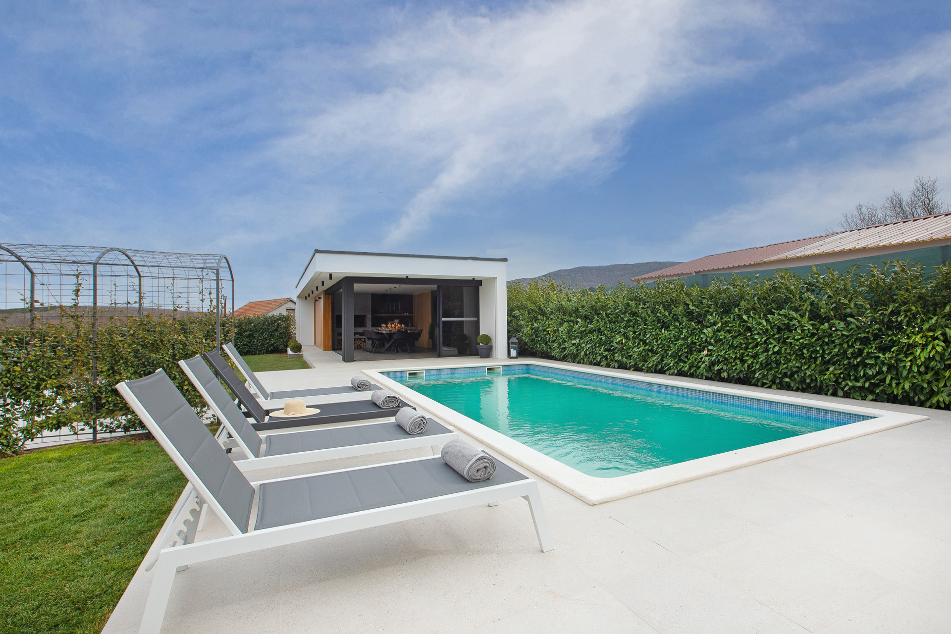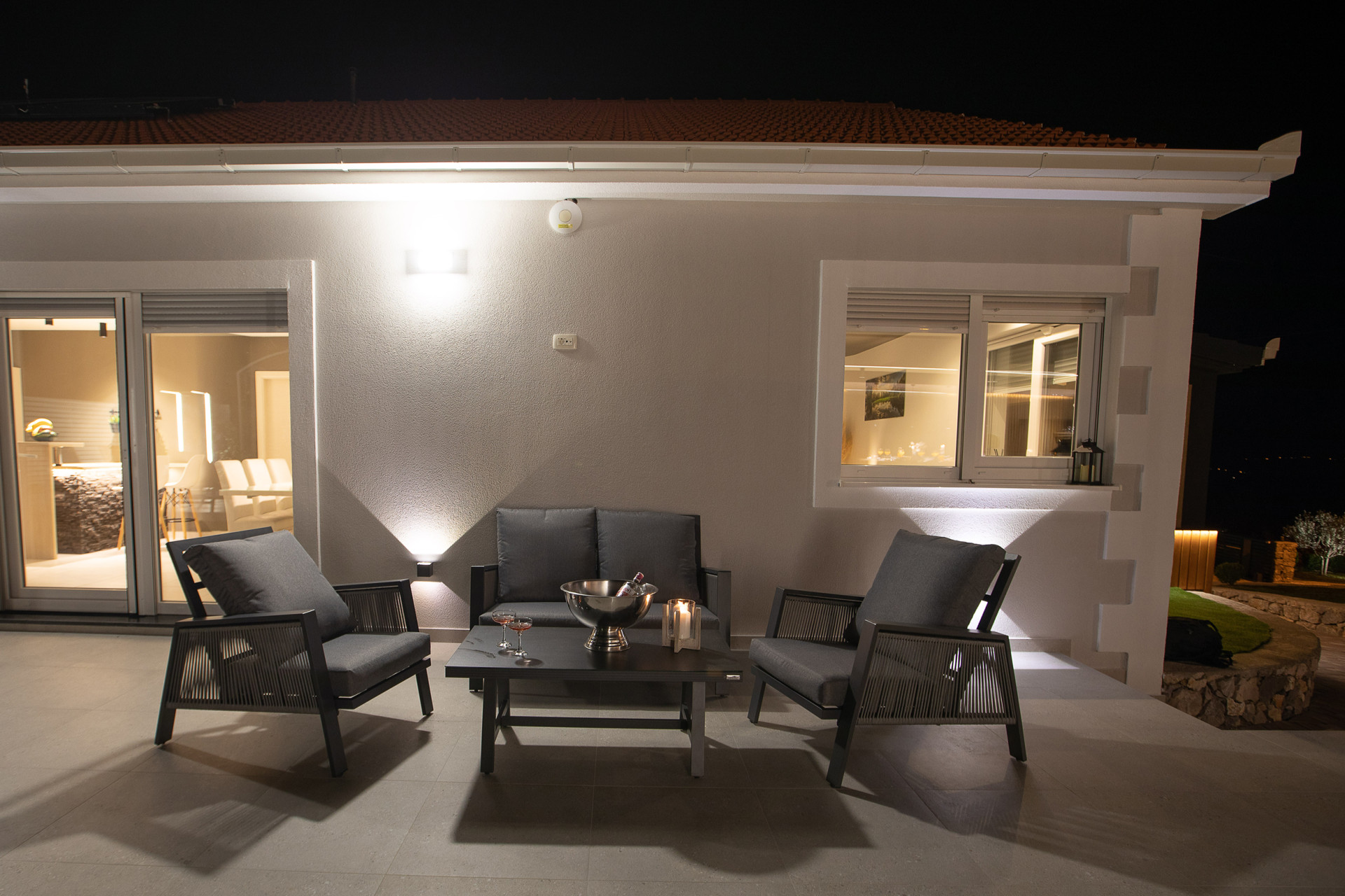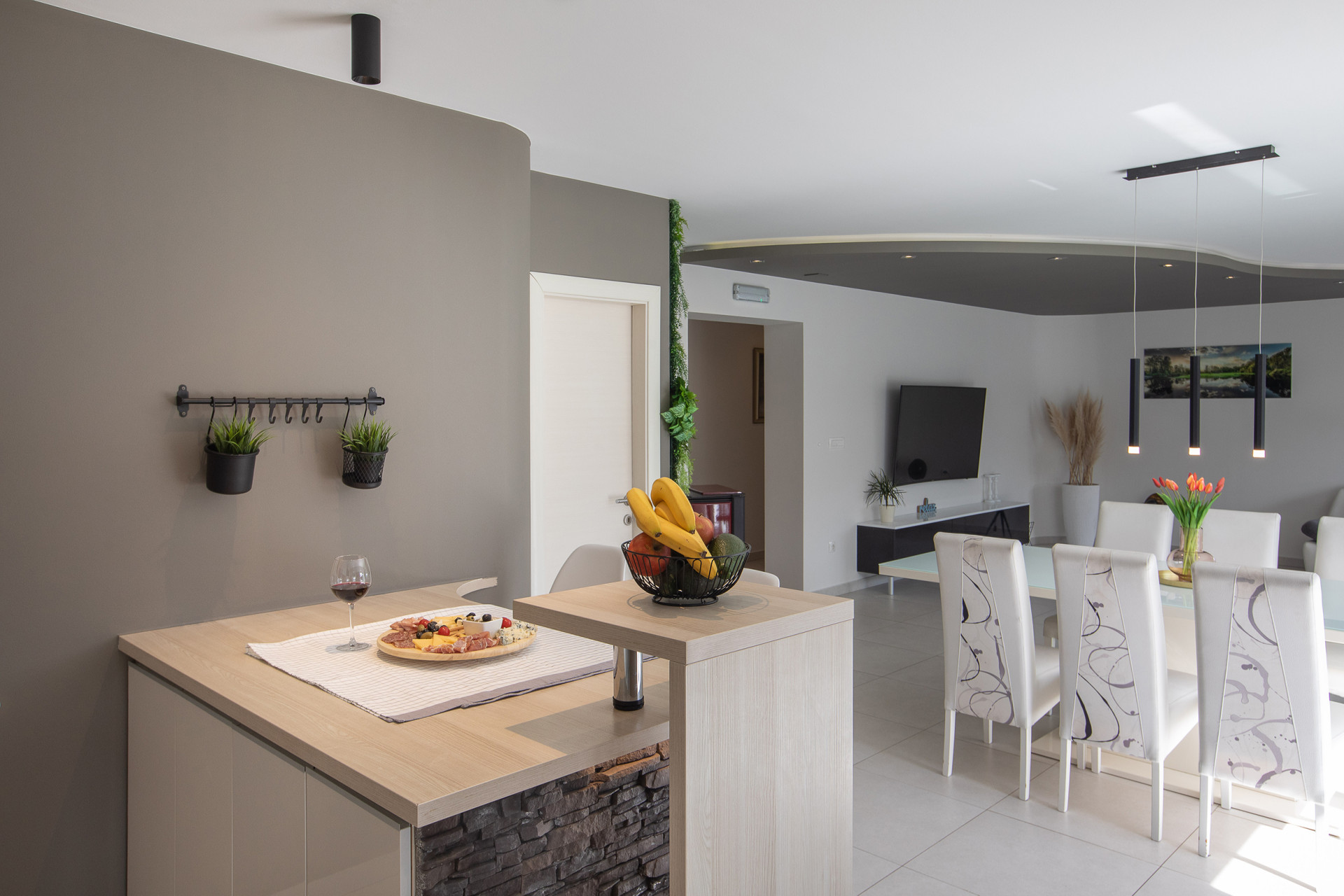 This decent one-story house speaks for itself with its design. The elegant interior decoration contrasts with the surrounding rural area, contributing to a special experience of a Mediterranean holiday. A spacious living room and a modern fully equipped kitchen with a dining room will charm you with its black and gray aesthetics.
