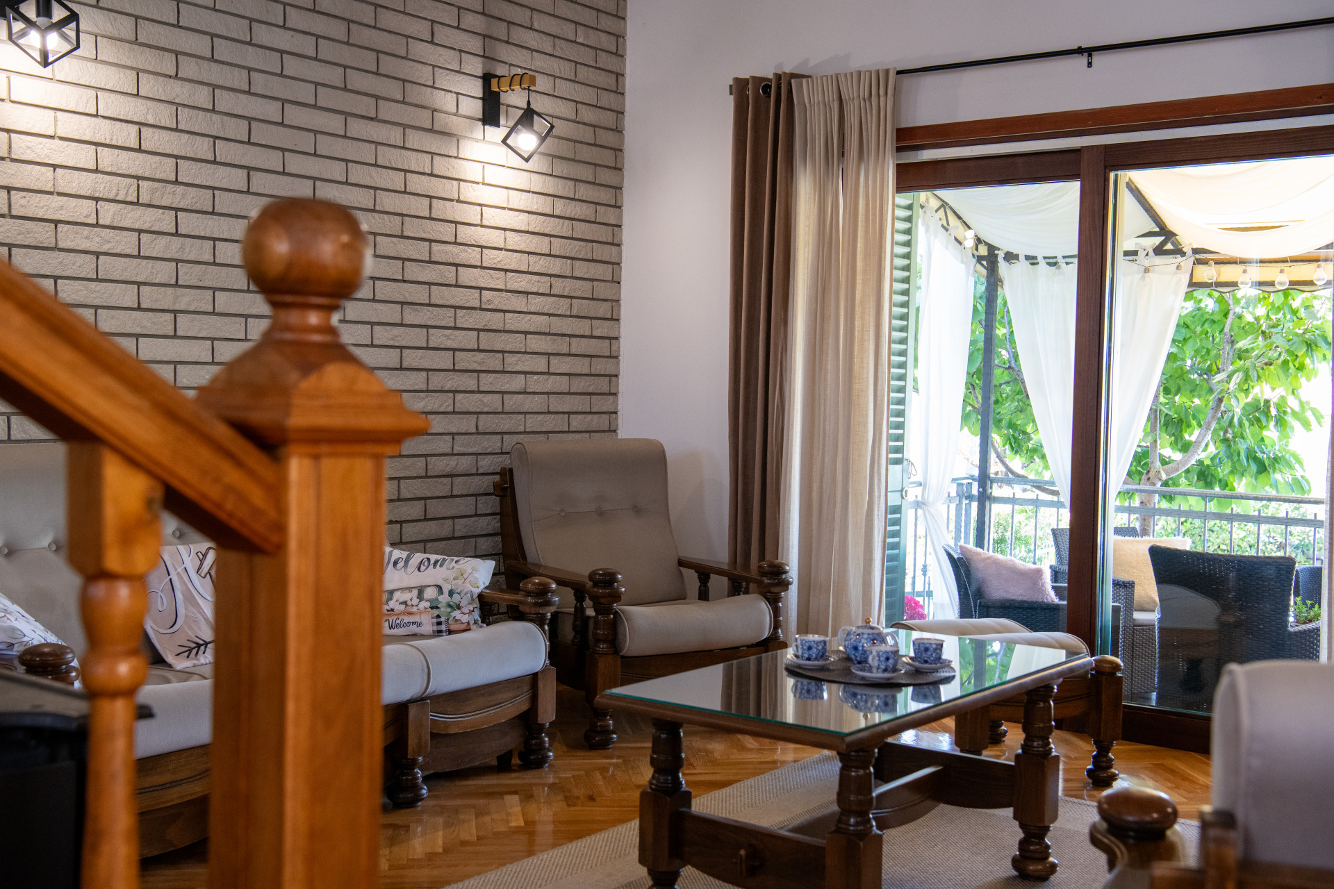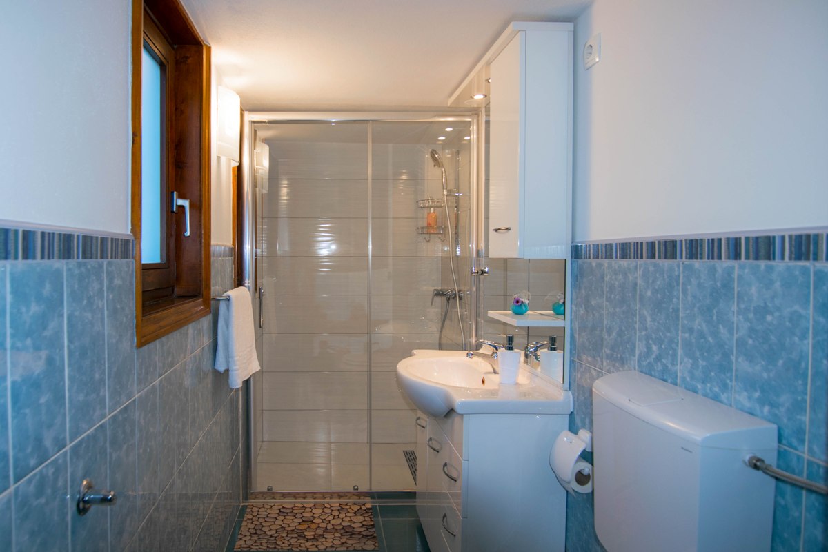 It consists of two floors. On the ground floor there is a bathroom and a kitchen with a spacious living room with a view of the pool.