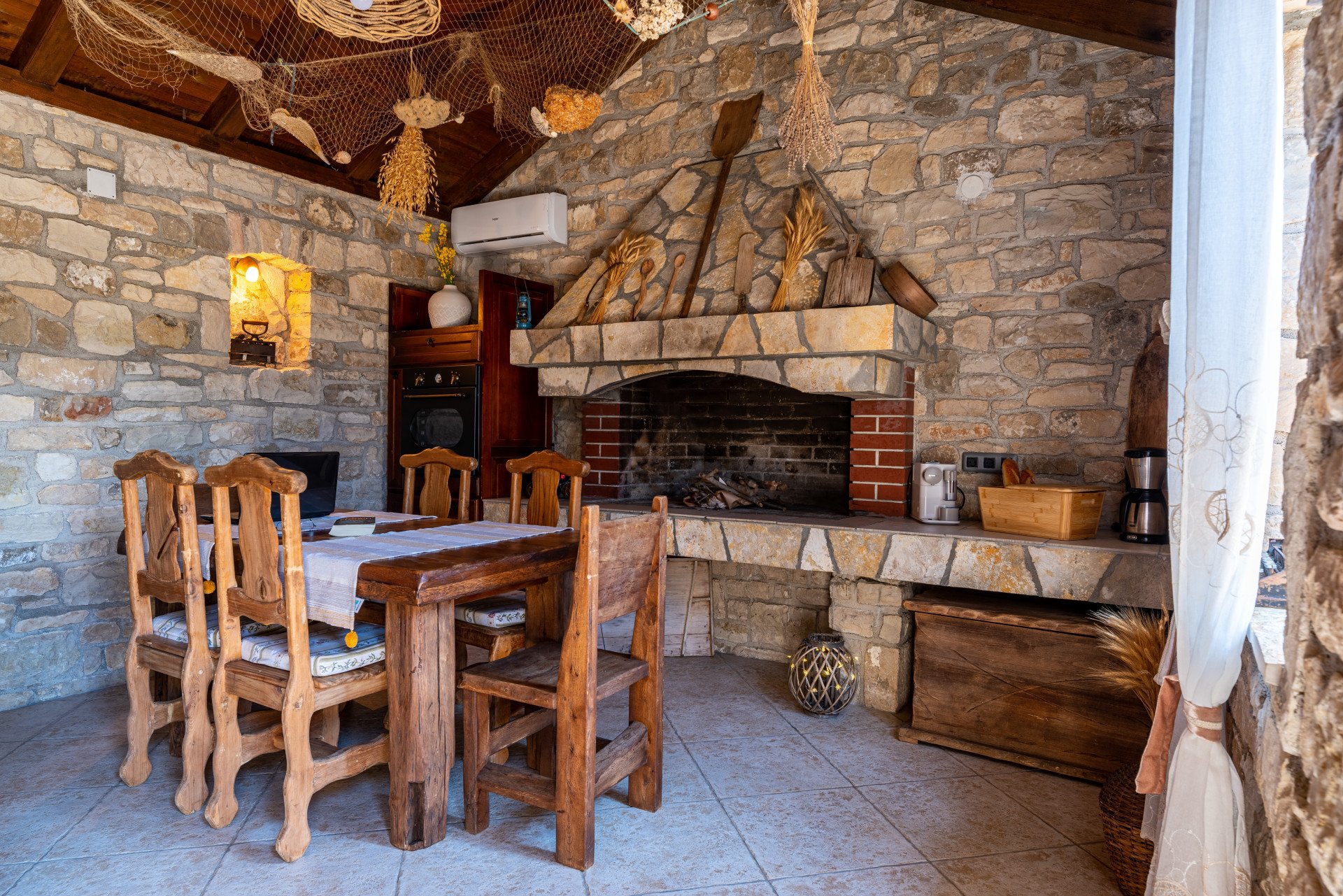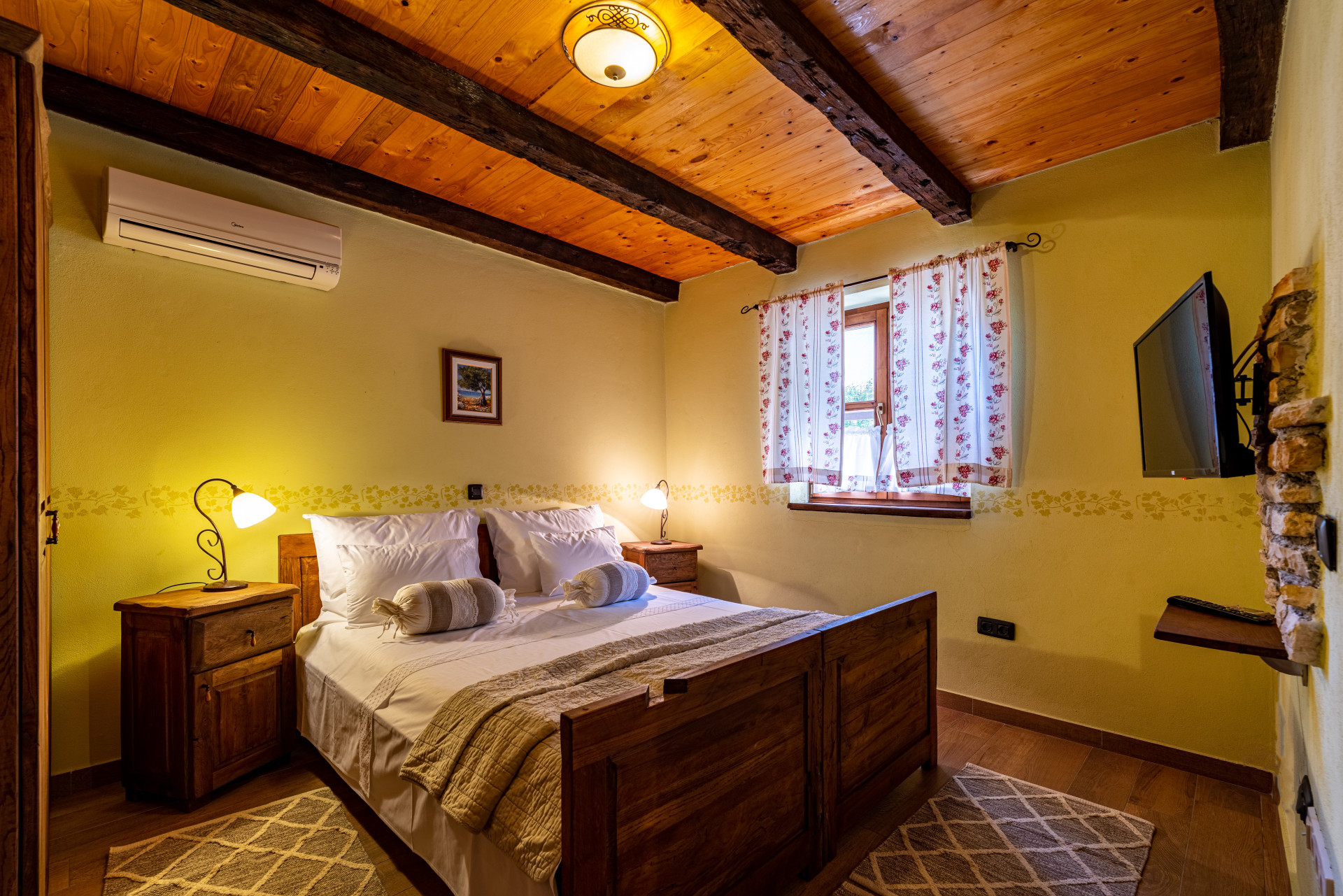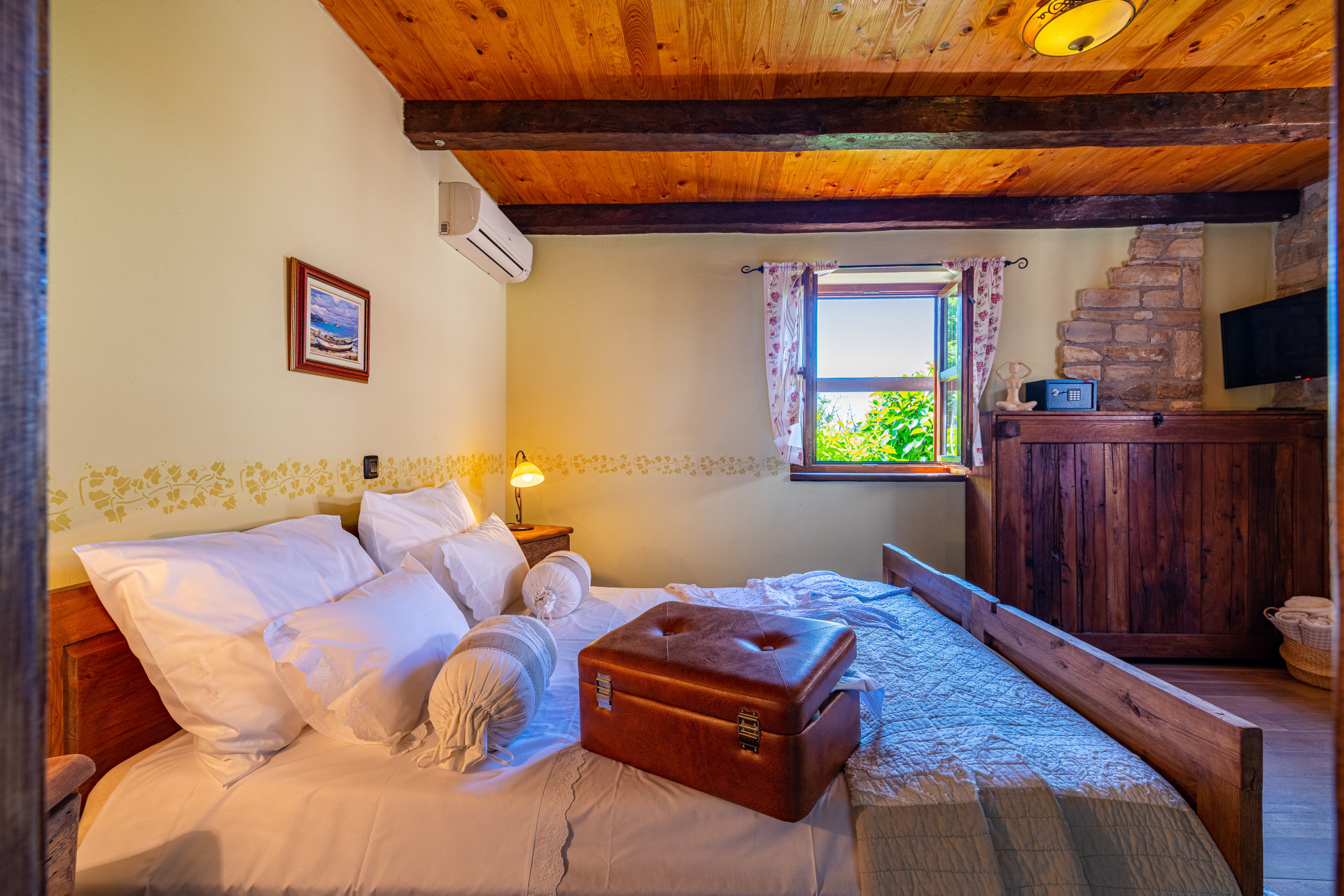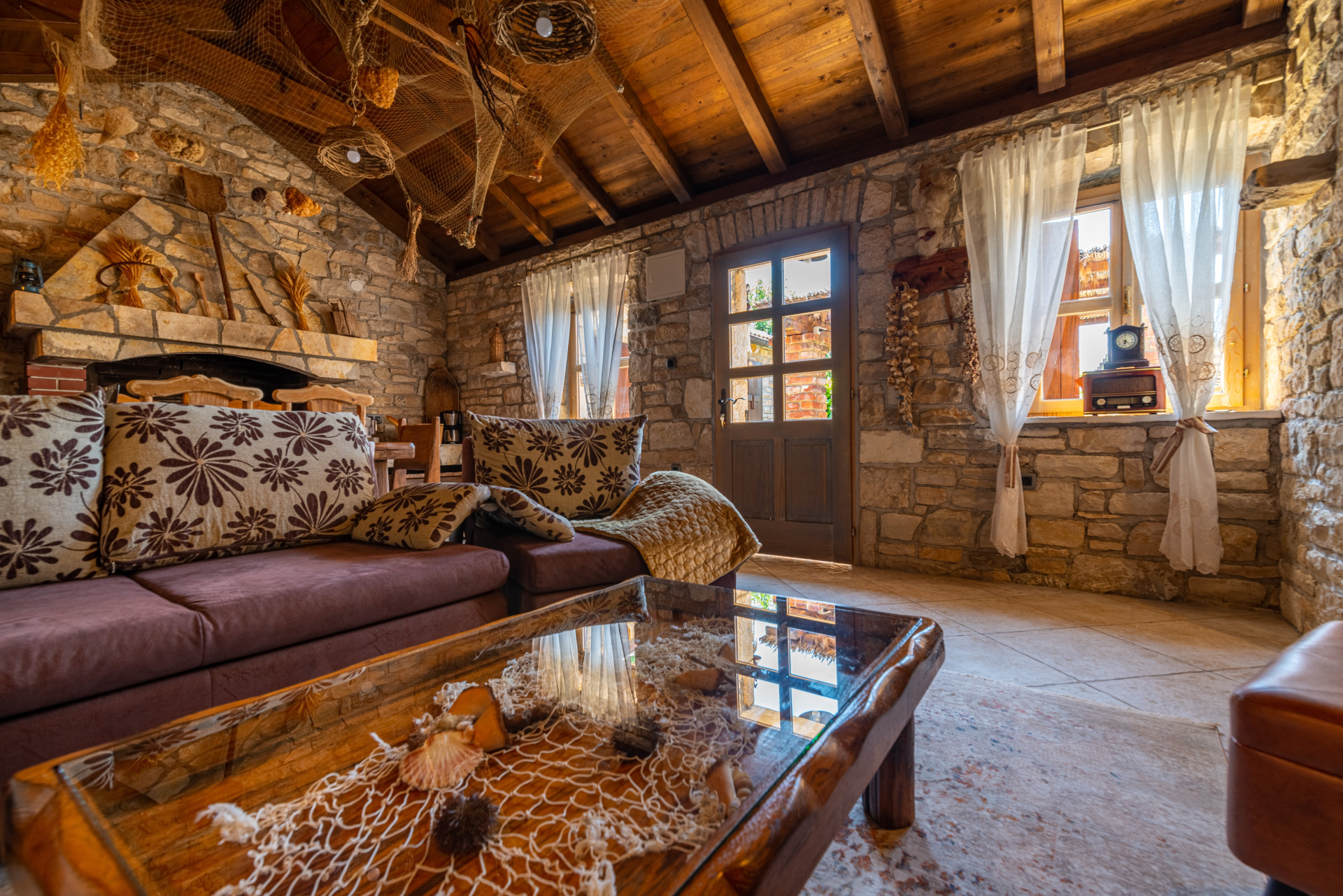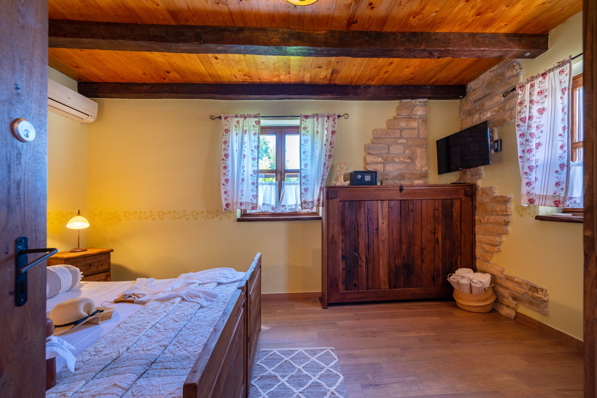 This 2-bedroom villa has a maximum capacity of six people. Both bedrooms have a double bed and a private bathroom. The stone design exudes a traditional style, enriched with wooden decor.